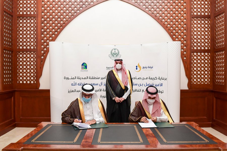 شهد صاحب السمو الملكي الأمير فيصل بن سلمان بن عبد العزيز، أمير منطقة المدينة المنورة مراسم توقيع مذكرتي تعاون بين غرفة ينبع وجامعة الأمير مقرن بن عبد العزيز وشركة نماء المنورة تستهدف تعزيز الشراكة والتعاون بين القطاعين الحكومي والخاص لزيادة الفرص لرائدات ورواد الأعمال بالمنطقة.