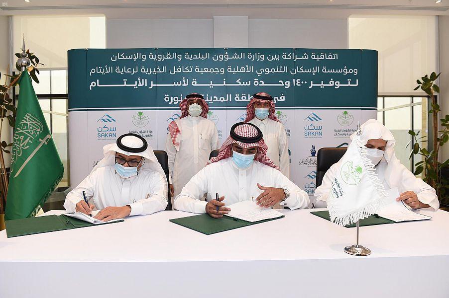 تكاتفت أيادي ممثلي وزارة الشؤون البلدية والقروية والإسكان ومؤسسة الإسكان التنموي وجمعية تكافل الخيرية في مسعي لتفعيل دور القطاع غير الربحي في قطاع الإسكان وتحفيزه لتوفير 1400 وحدة سكنية لأسر الأيتام بمنطقة المدينة المنورة وذلك بتوقيع اتفاقية شراكة تستهدف تحقيق التكامل بين الإسكان التنموي والقطاع غير الربحي وتوفير وحدات سكنية لمستفيدي جمعية تكافل من أسر الأيتام وتعزيز مشاركة أفراد المجتمع لتحقيق استقرار الأسر الأشد حاجة