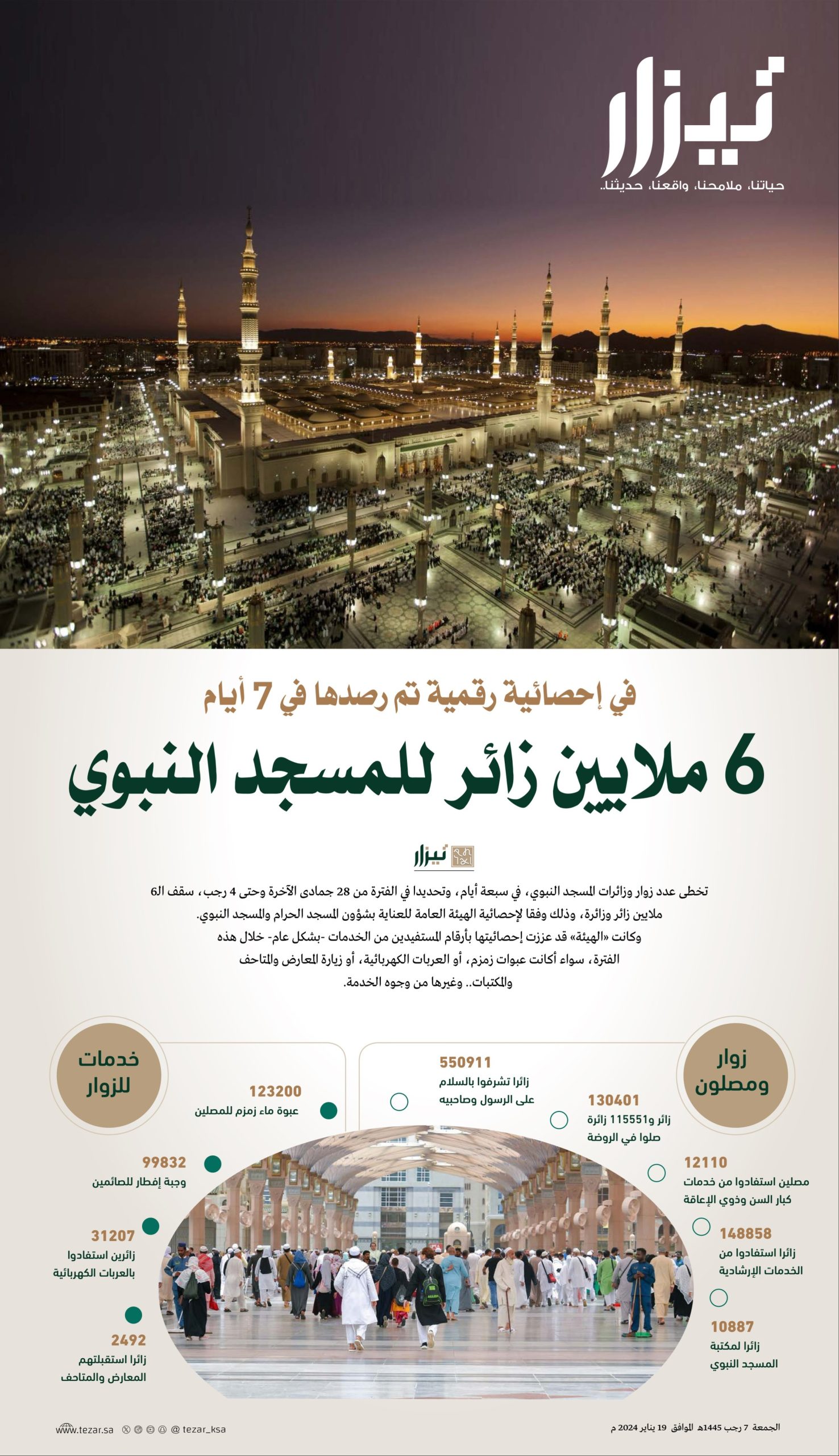 الرئيسية/مطويات pdf/6 ملايين زائر للمسجد النبوي الشريف في 7 أيام 6 ملايين زائر للمسجد النبوي الشريف في 7 أيام 1 فبراير، 2024 فيسبوك تويتر لينكدإن واتساب تيلقرام مشاركة عبر البريد طباعة احصائية 1 فبراير، 2024 فيسبوك تويتر لينكدإن واتساب تيلقرام مشاركة عبر البريد طباعة اظهر المزيد شاركها فيسبوك تويتر لينكدإن واتساب تيلقرام مشاركة عبر البريد طباعة