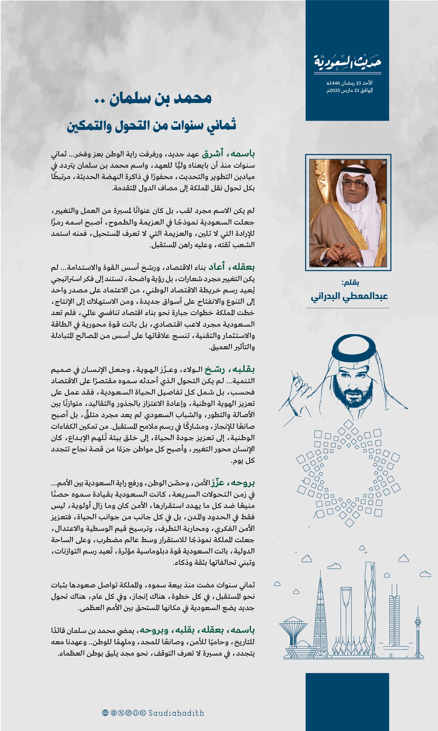 الرئيسية/مطويات pdf/محمد بن سلمان.. ثماني سنوات من التحول والتمكين محمد بن سلمان.. ثماني سنوات من التحول والتمكين 24 مارس، 2025 فيسبوك تويتر لينكدإن واتساب تيلقرام مشاركة عبر البريد طباعة محمد بن سلمان 24 مارس، 2025 فيسبوك تويتر لينكدإن واتساب تيلقرام مشاركة عبر البريد طباعة اظهر المزيد شاركها فيسبوك تويتر لينكدإن واتساب تيلقرام مشاركة عبر البريد طباعة