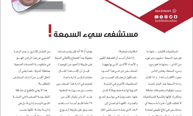 أكمل القراءة »بقلم: محمد البلادي المستشفيات كالبشر ..منها ما هو جيد السمعة ؛ محبوب ومرغوب من الناس .. ومنها ما هو رديء…