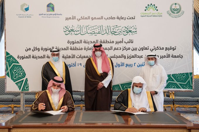 شهد صاحب السمو الملكي الأمير سعود بن خالد الفيصل نائب أمير منطقة المدينة المنورة توقيع اتفاقية ومذكرة تعاون بين مركز دعم الجمعيات بالإمارة وجامعة الأمير مقرن بن عبد العزيز والمجلس الفرعي للجمعيات الأهلية بالمنطقة وتستهدف الاتفاقية التعاون في الدراسات والأبحاث لتطوير القطاع غير الربحي ودعم نمو القطاع وتمكينه من بناء القدرات والاستدامة المالية.