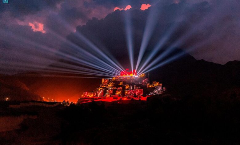 تيزار تزينت واجهة 58 منزلاً تراثياً بقرية ذي عين الأثرية بعروض الصوت والضوء احتفاء بتسجيل فنون الخط العربي في قائمة…